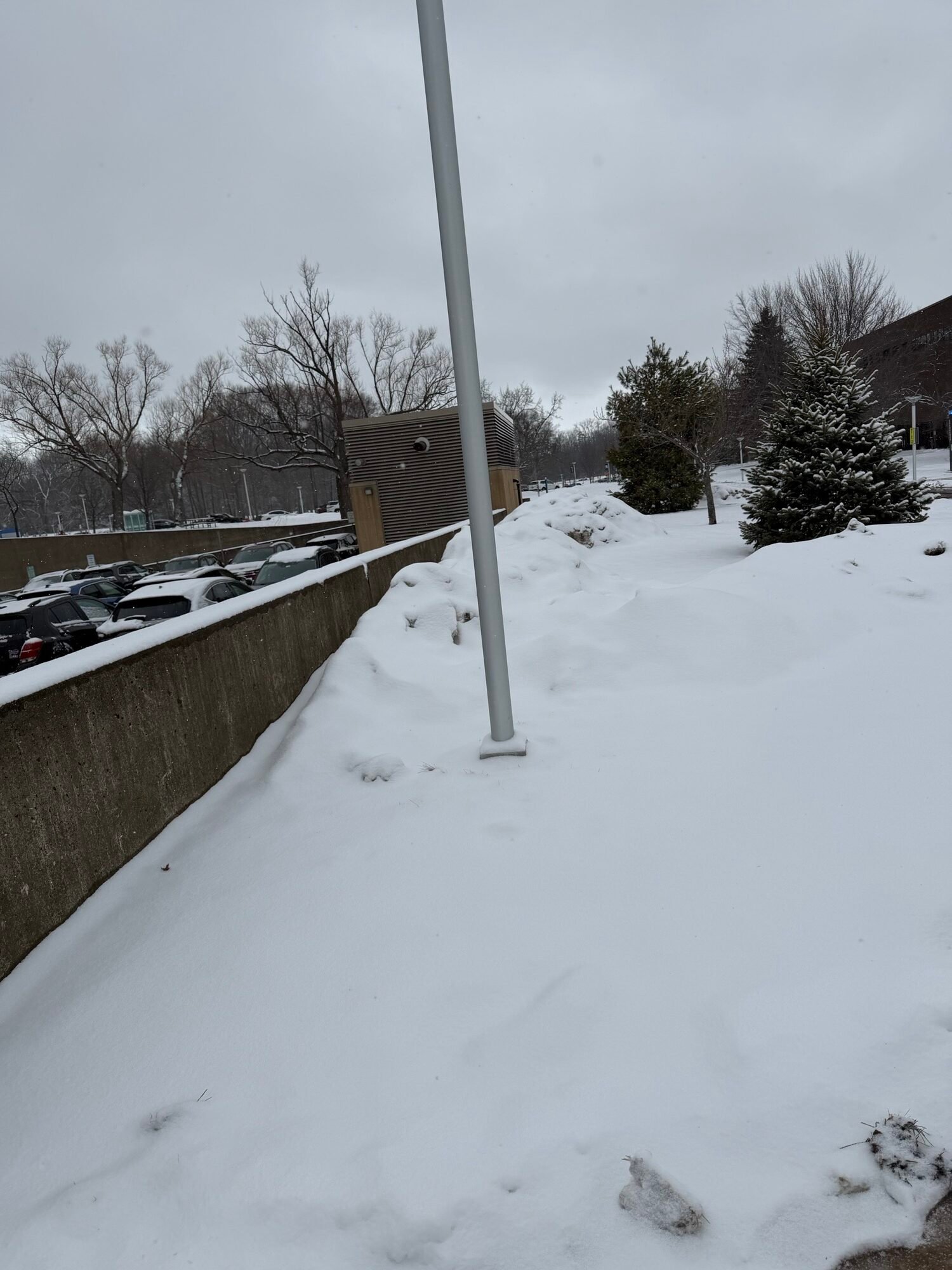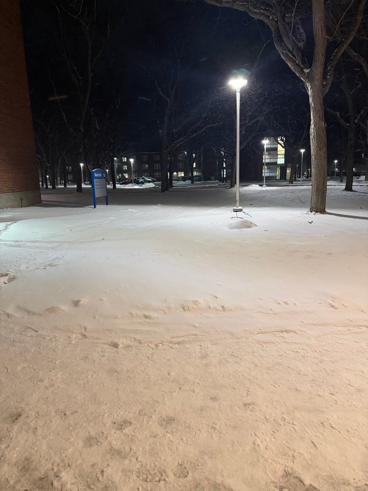 This is what winter really feels like at SUNY Fredonia. The snow doesn’t just cover the ground; it takes over the whole scene. That pole…