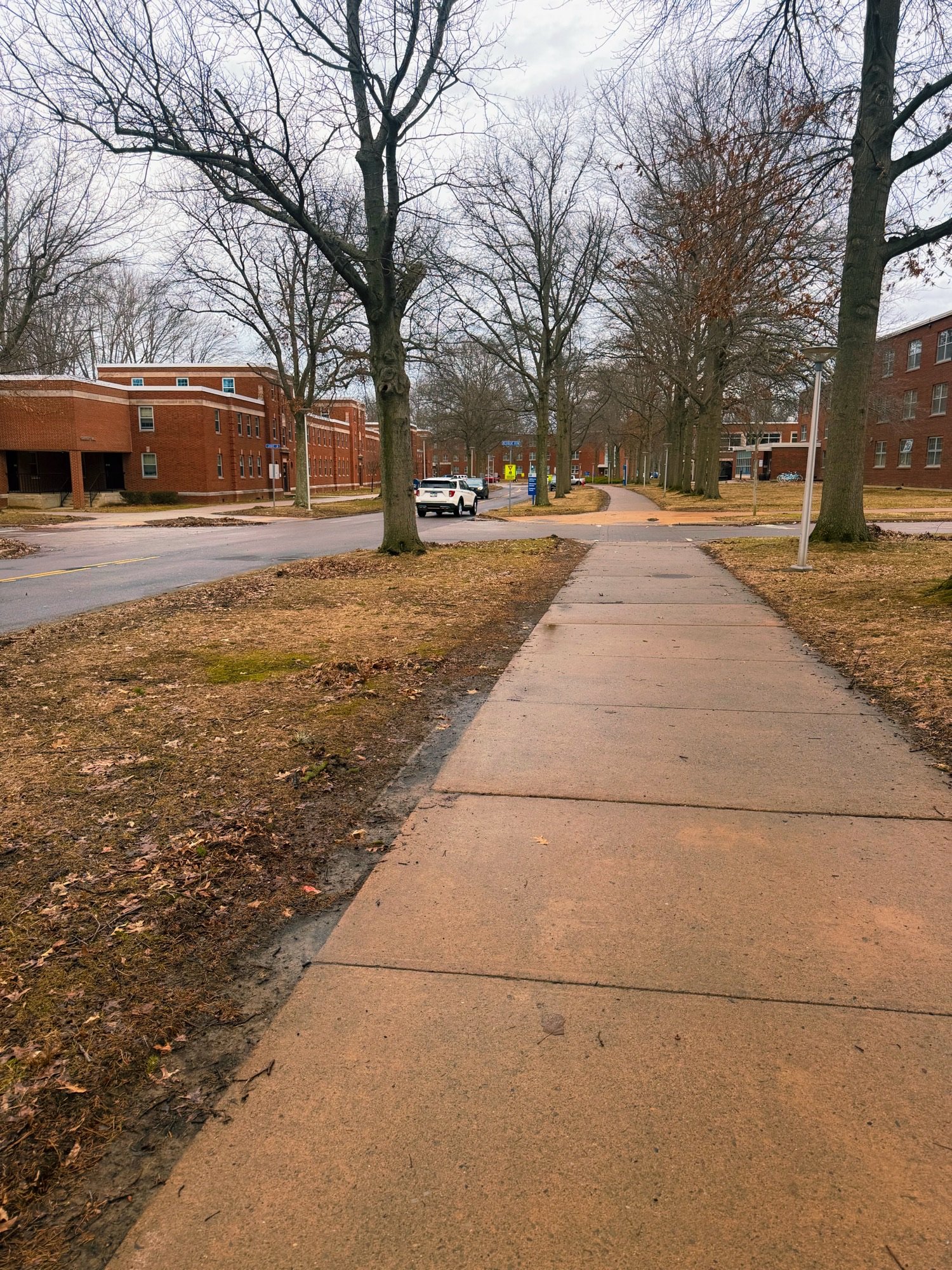 Sundays on campus always feel different, and this photo captures that quiet energy perfectly. The sidewalk stretches forward between bare trees, creating a calm and…