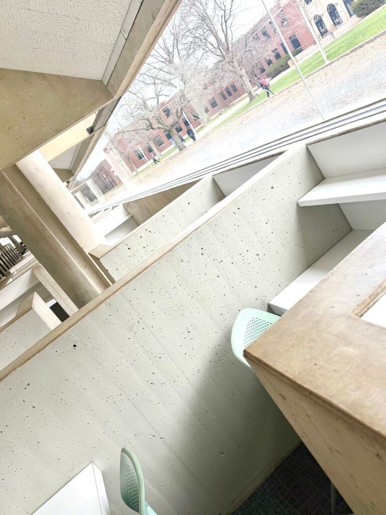 The view of the brick buildings, the trees, and the open lawn reminds me that life is still moving, even when I’m stuck on a paragraph or trying to figure out what to write next. I come to this spot when I need clarity. The natural light is soft and steady, and it makes the space feel calm no matter what’s going on in my day.
