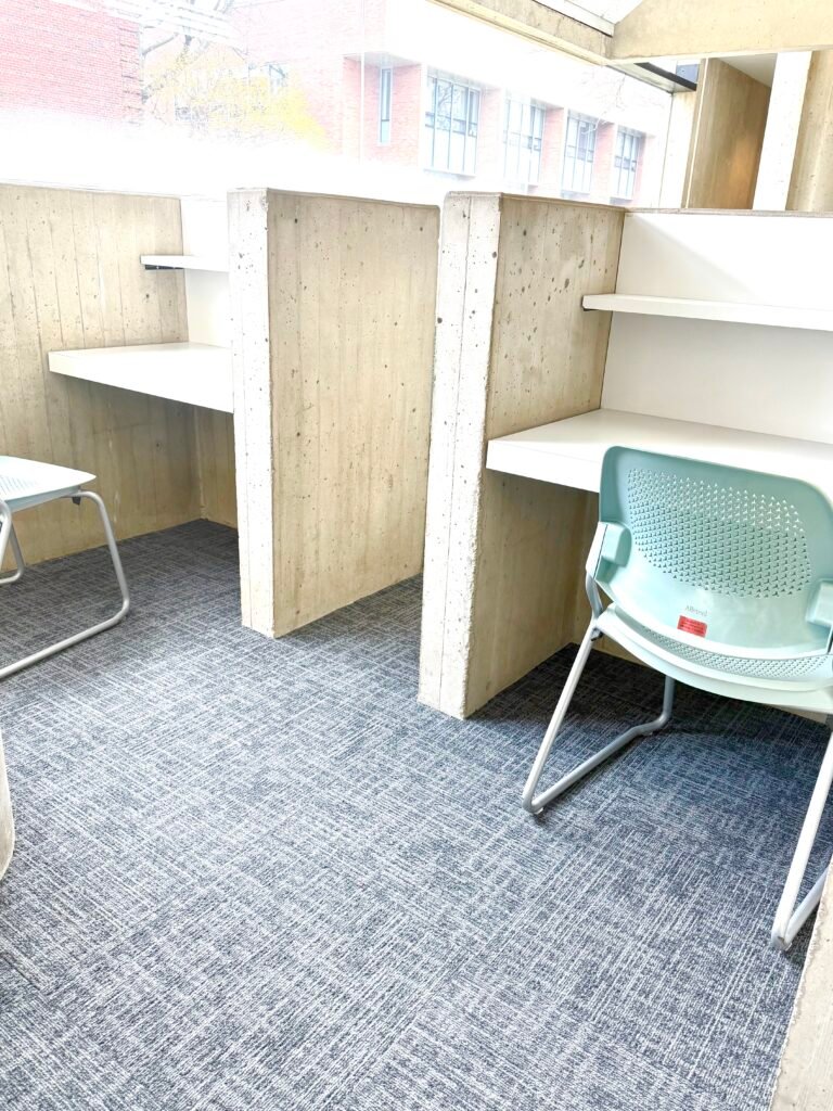 This is the corner where I get serious. The cubicles are simple white desks, concrete dividers, and light blue chairs, but that simplicity is exactly what helps me focus. When I sit here, it feels like the rest of the world disappears. It’s just me, my work, and the quiet.